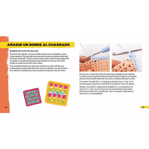 • Las fichas van acompañadas de un manual para aprender a interpretar los diagramas, crear bordes y uniones pulcros, y adaptar los patrones: puedes tejer los cuadrados ¡o ampliarlos para crear tus propios proyectos!