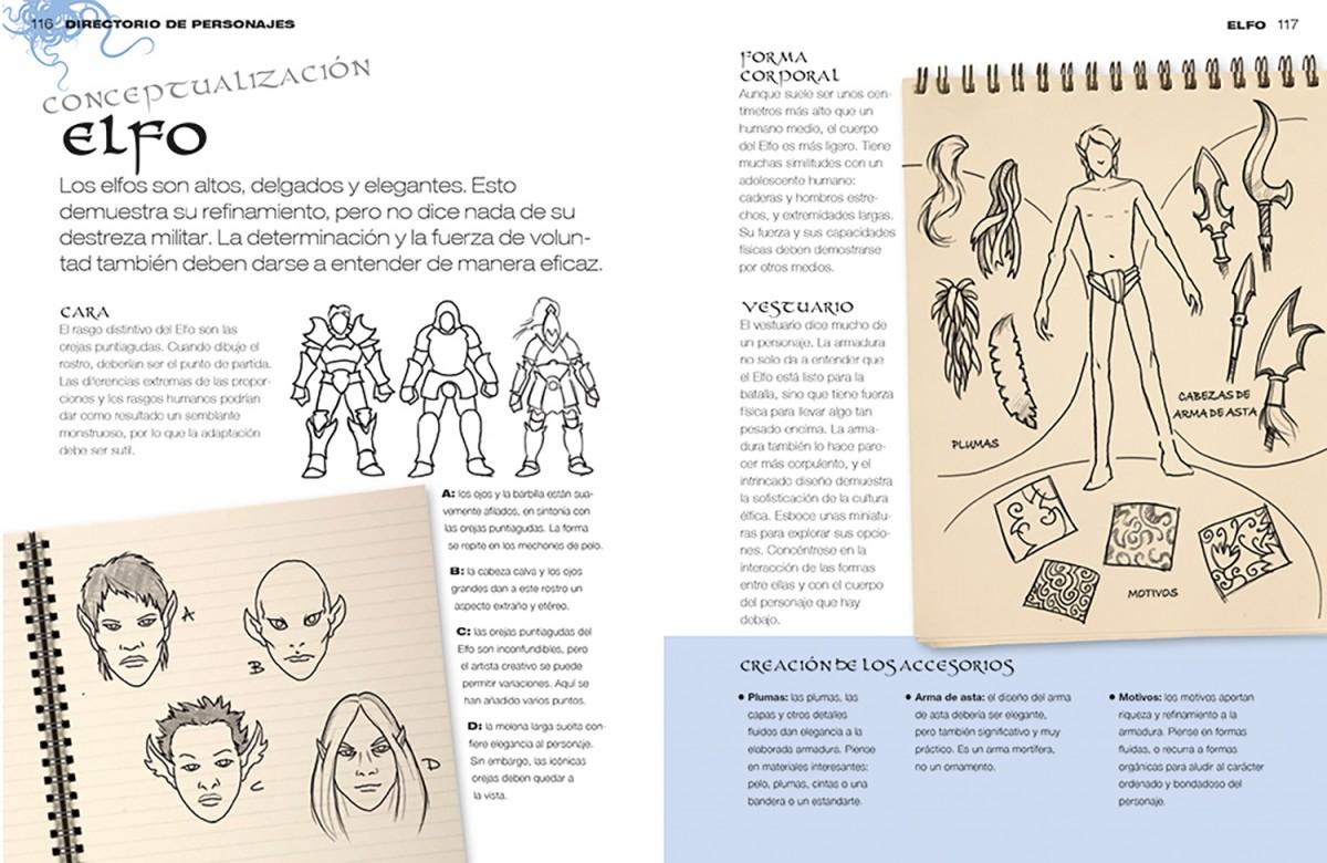 La ilustración definitiva de los personajes va acompañada de bocetos conceptuales y dibujos del proceso de construcción para que le resulte más fácil copiarlos o usarlos como punto de partida para crear sus propias figuras fantásticas.