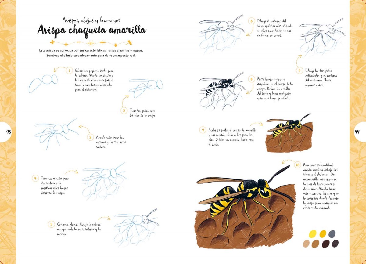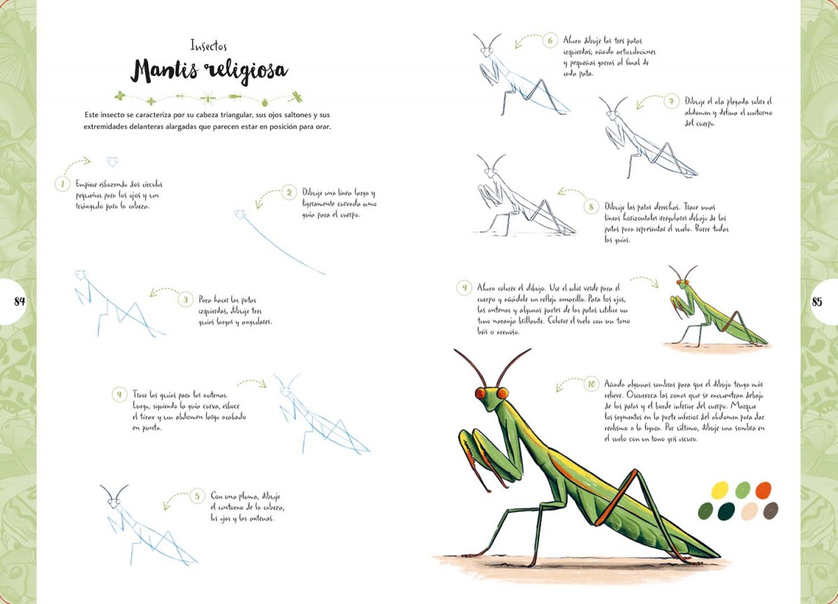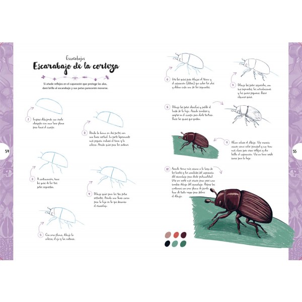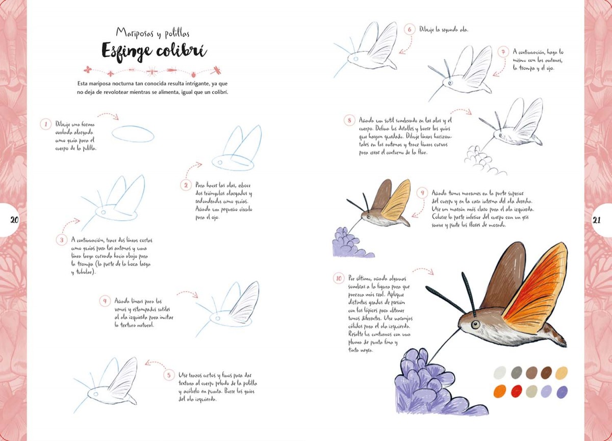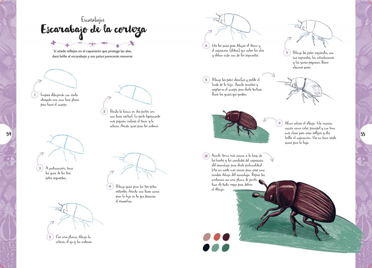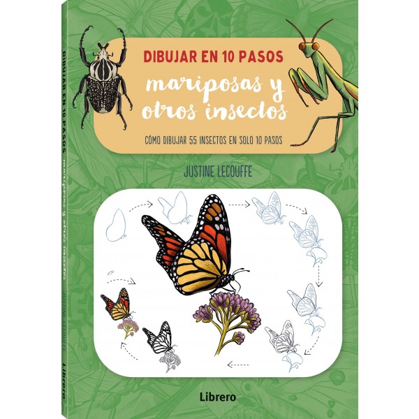 Dibujar en 10 pasos: mariposas y otros insectos enseña a dibujar más de 55 insectos diferentes paso a paso, desde escarabajos y mariposas hasta saltamontes, abejas y libélulas. La explicación básica sobre los materiales necesarios y el repaso general de las técnicas para colorear completan esta magnífica introducción al dibujo de una gran variedad de insectos.