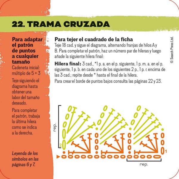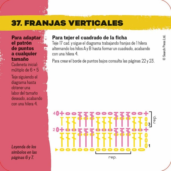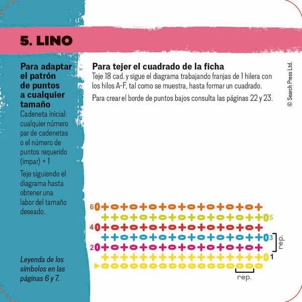 • Las fichas van acompañadas de un manual para aprender a interpretar los diagramas, crear bordes y uniones pulcros, y adaptar los patrones: puedes tejer los cuadrados ¡o ampliarlos para crear tus propios proyectos!